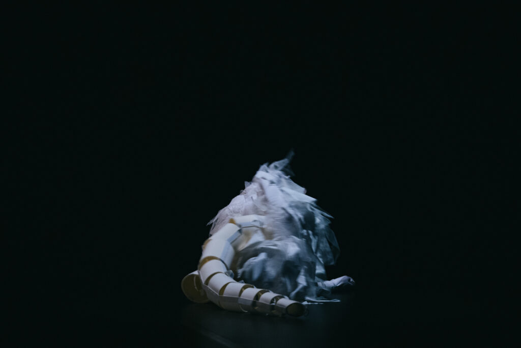 ほの暗い舞台の奥で、白い何かがうごめいている。フリンジのようなもじゃもじゃ、ダラリと床に垂れる脊柱。客席の方を向いているのか、それとも背を向けているのか。どっちがトップでどっちがボトムなのか。いずれも正解であり、不正解な気もする。こうして見る者の知覚を倒錯させる「カイジュウ」は、その形態、ひいては自己が何者であるかを未決定なままにしておく存在 X だ。
