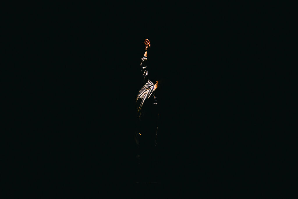 自分の心が傷ついたという事実を明確に自覚した時にはもう、ずいぶん時間が経っていて、あの時すぐに怒りを言葉にしたり、無理をするのはやめたりすればよかった…と後悔したことはないだろうか。自分の痛みを笑ってやり過ごした記憶を抱える誰もが、この作品の主人公になり得る気がした。中盤で使用された音源の、囁くような「あっ」の音の連発は、誰かが胸の内で小さく何かに気づくようで、チクリと胸に刺さる。後半になると、高瀬はダウンをたおやかに畳んで、靴や靴下も丁寧に脱ぐ。四角形のスポットライトのなかを覗き込む。髪をかき上げる。正座する。これらは情緒と、冷たいタスクの中間にある温度感で遂行されてゆく。そして、決して笑わないが、感情を曝け出すわけでもない抑制された高瀬の表情は、自己の痛みや異和感をありのまま表現することを妨げる抑圧への、静かな抵抗のようにも受け取れた。