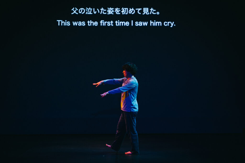 作品の序盤では〈男としては外では母親のことをお袋と呼んでいる〉という、小さな秘密が明かされる(文脈上「ママ」や「お母さん」等ではなく、という意味だろう)。振付家が不安げに自分の指を咥えるシーン、また震える両手を股に挟む動きも印象的だった。そして〈父が泣いた姿を見た〉というつぶやきのような独白は、振付家の中でいったい何が喪失されたのかを一挙にこちらに察知させる。それはタフな心身を備えた「父」の像であり、それはさらに「男としての」振付家が自己に課すイメージと一部重なるものでもあったことが伺える。