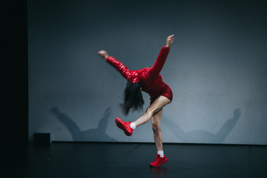 このように洗練された作品のトーンは、その背後にある振付家の傷や、抑圧された怒りの存在を、かえって強く仄めかすことになる。とくに作中の様々なモチーフは、高瀬の記憶や心情の寓意のように効いてくる。真っ赤な色で統一されたショートパンツ、ダウンジャケット、スニーカーは、脚の肌色とのコントラストによって、剥き出しの肉を連想させる。高瀬が舞台の縁に腰かけ、水入りのボトルの栓を開けると、中身が黒く染まってギョッとさせられる。その液体を平然と飲む様子は、うっすらと痛々しく、会場に静かな緊張感を与えた。