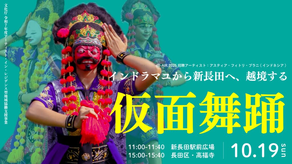 19日(日)には、DANCE BOX Artist In Resident 2025招聘アーティスト、インドネシア・インドラマユ地方の仮面舞踊手アスティア・フィトリ・プラニによるダンス・パフォーマンス『インドラマユから新長田へ、越境する仮面舞踊。』を上演。関西を拠点に活動する3名のダンサー(いはらみく、十川大希、趙恵美)にも仮面舞踊を手渡します。