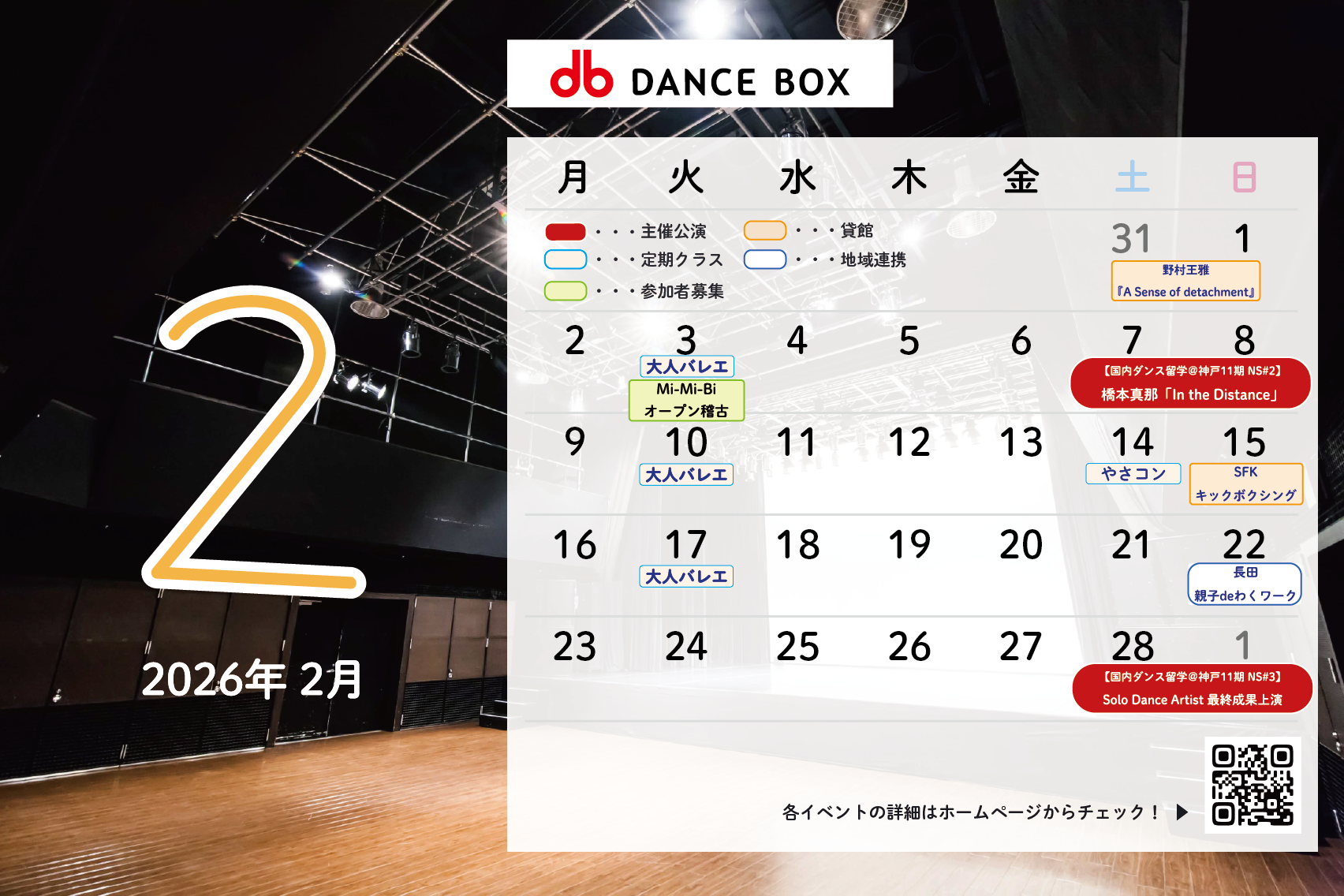 2月のDANCEBOXは、「国内ダンス留学@神戸11期」アーティストによる新作・ショーケース公演から貸館公演まで、多彩なラインナップでお届けします。