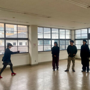 ・同世代のメンバーと共に「劇場で踊る」ということについて考え、クリエーションします。様々な媒体や場所で「ダンス」を目にするようになった今、区切られた空間「劇場」で生まれるダンスについてリサーチします。また、劇場外に繰り出して、内と外の違いについても考えます。本人にとって、「踊りやすい場所」「踊りにくい場所」「踊れない場所」など、個人が持つ踊りと場所の関係性を劇場の外に出てメンバー間でリサーチします。